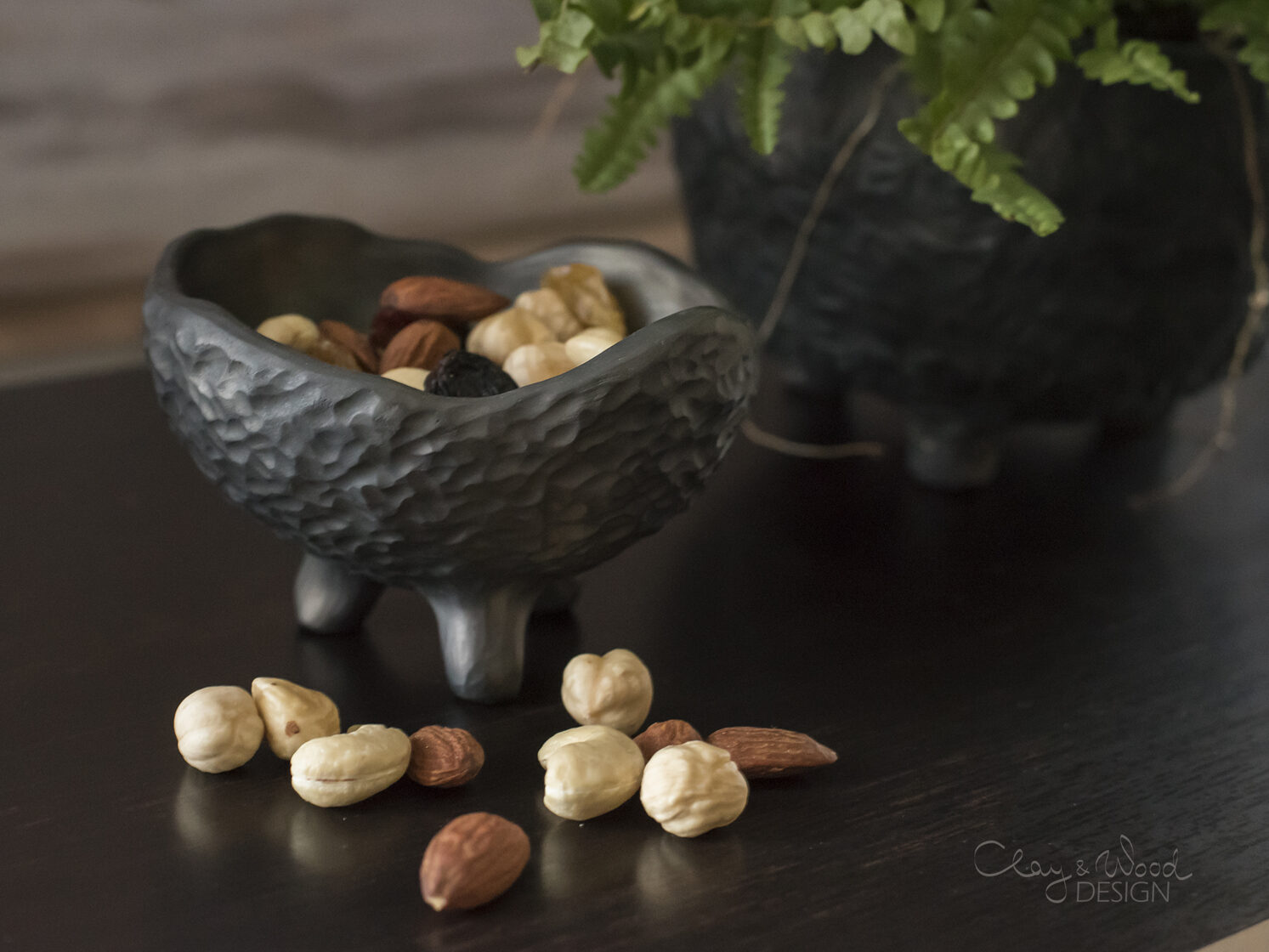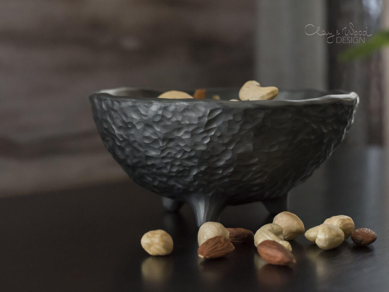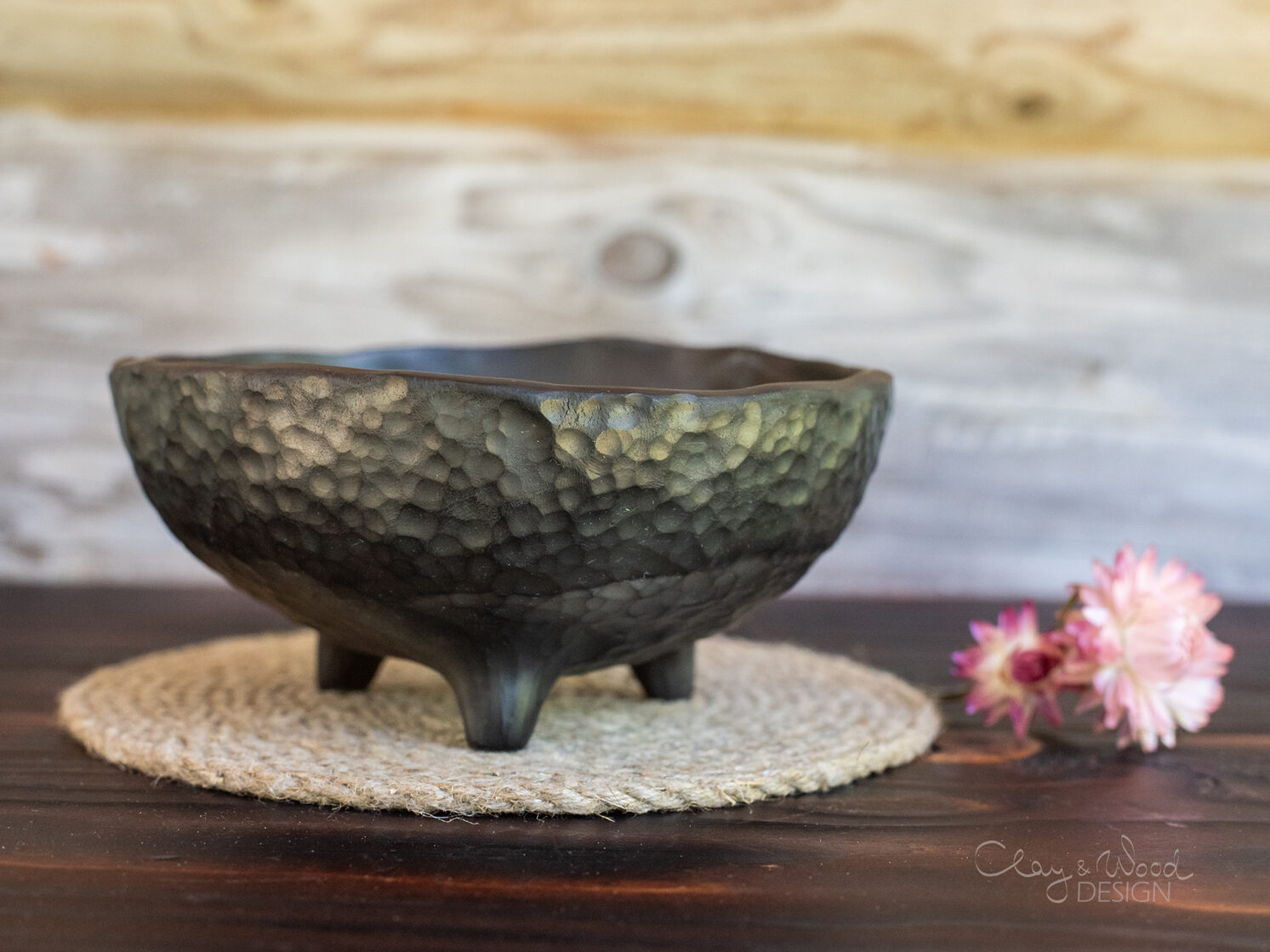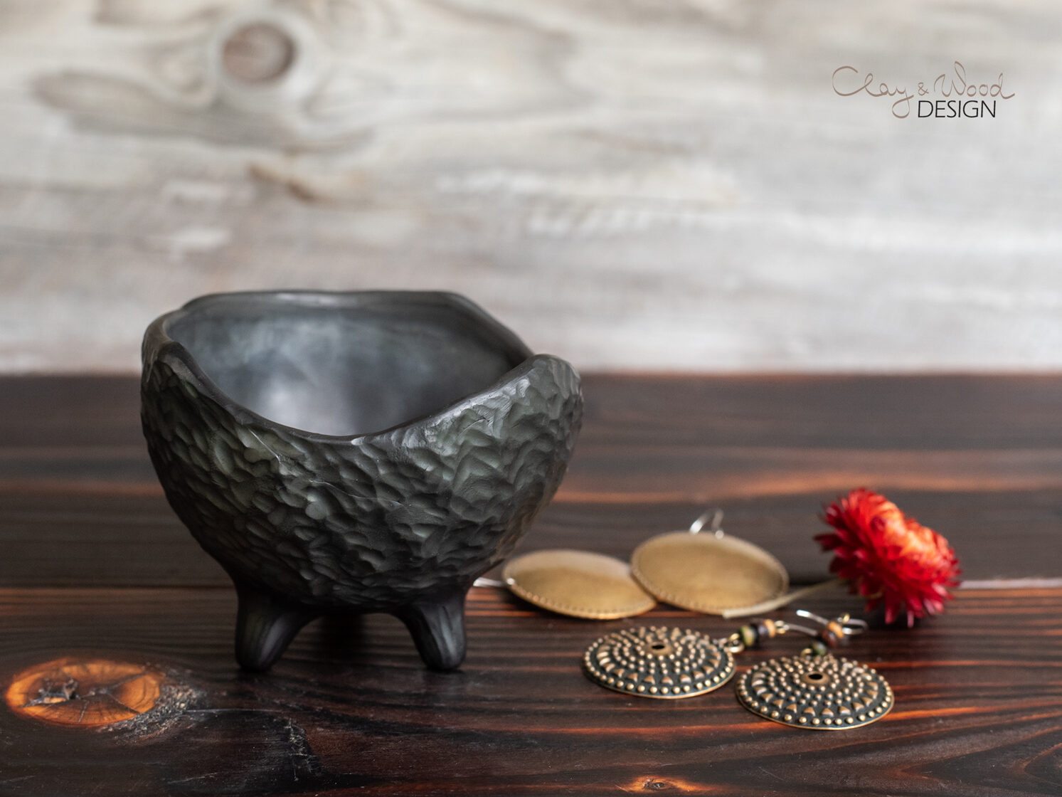 Handmade black ceramics with texture. Unique shaped serving bowls and dishes. Different sizes of ceramic planters. Pinch pots on legs for jewelry. Candle holders. Shop >>