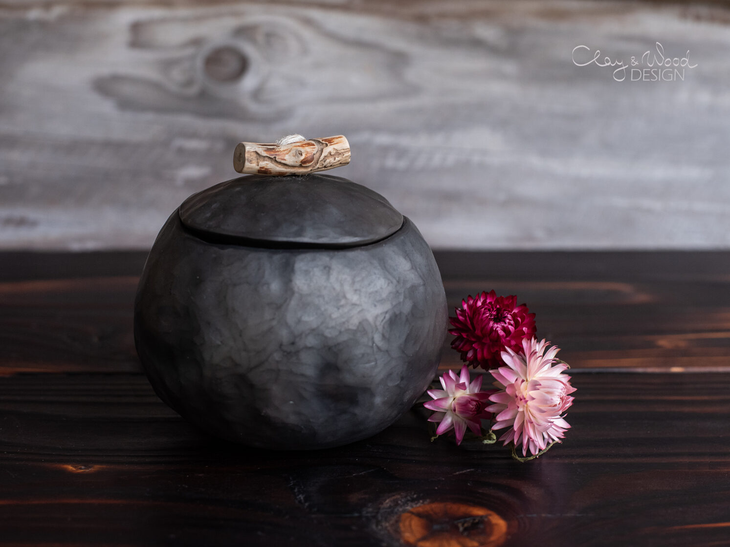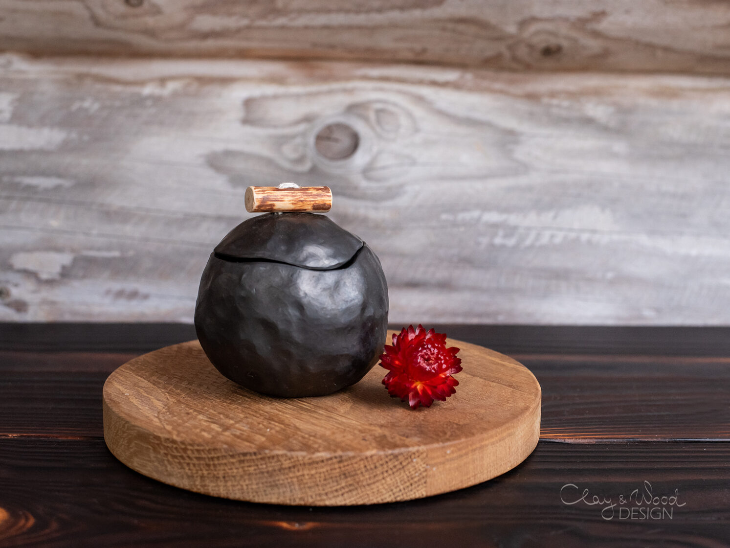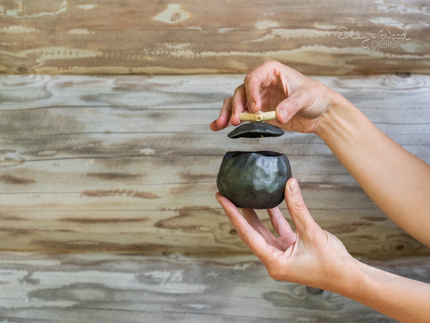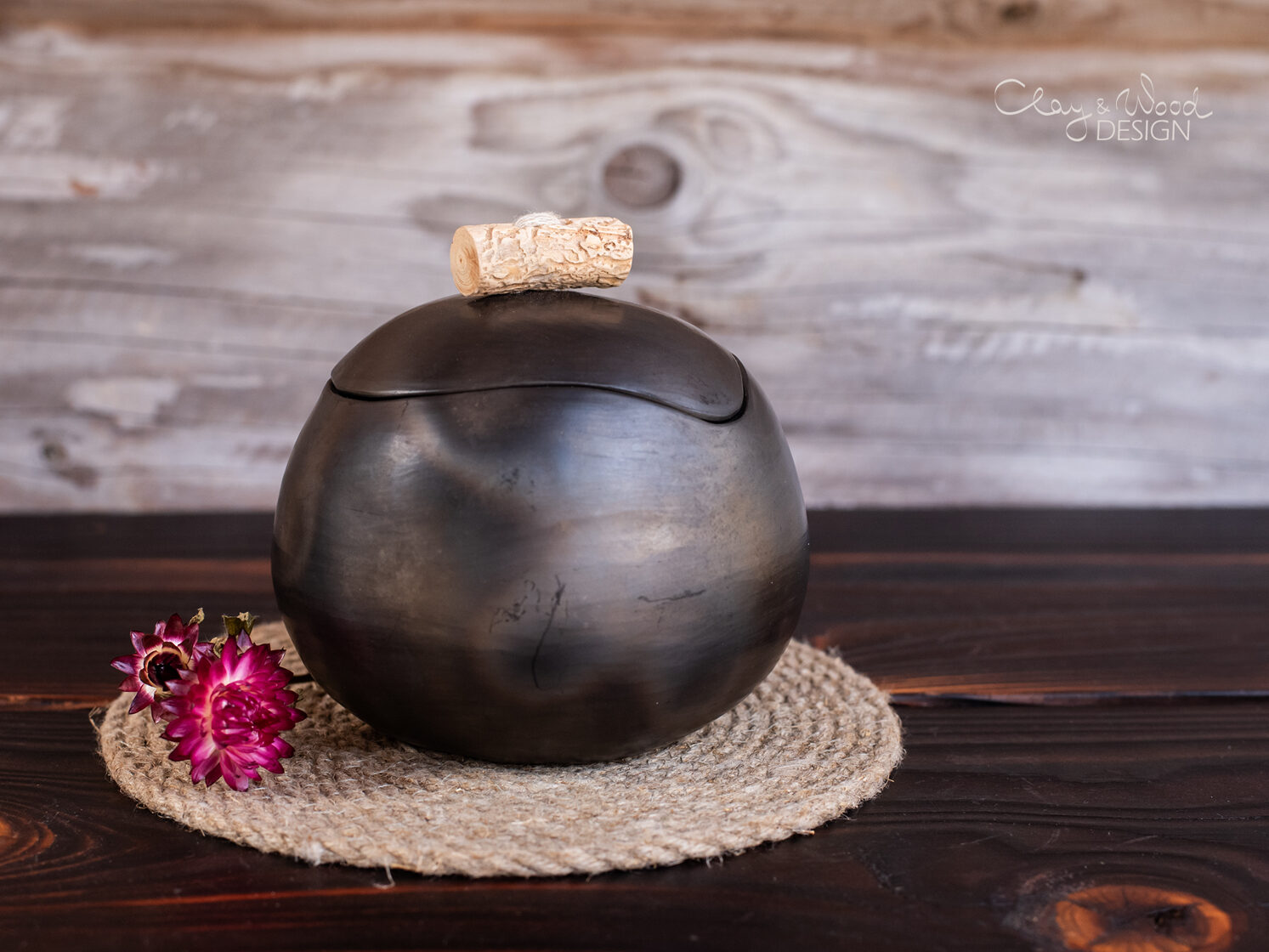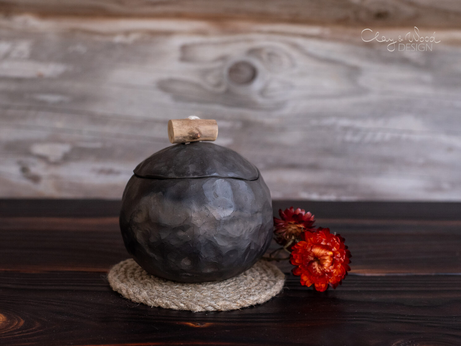 Handmade black ceramic cellar with lid and wooden handle -