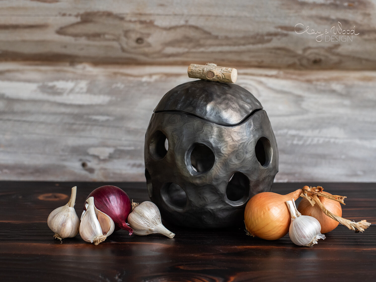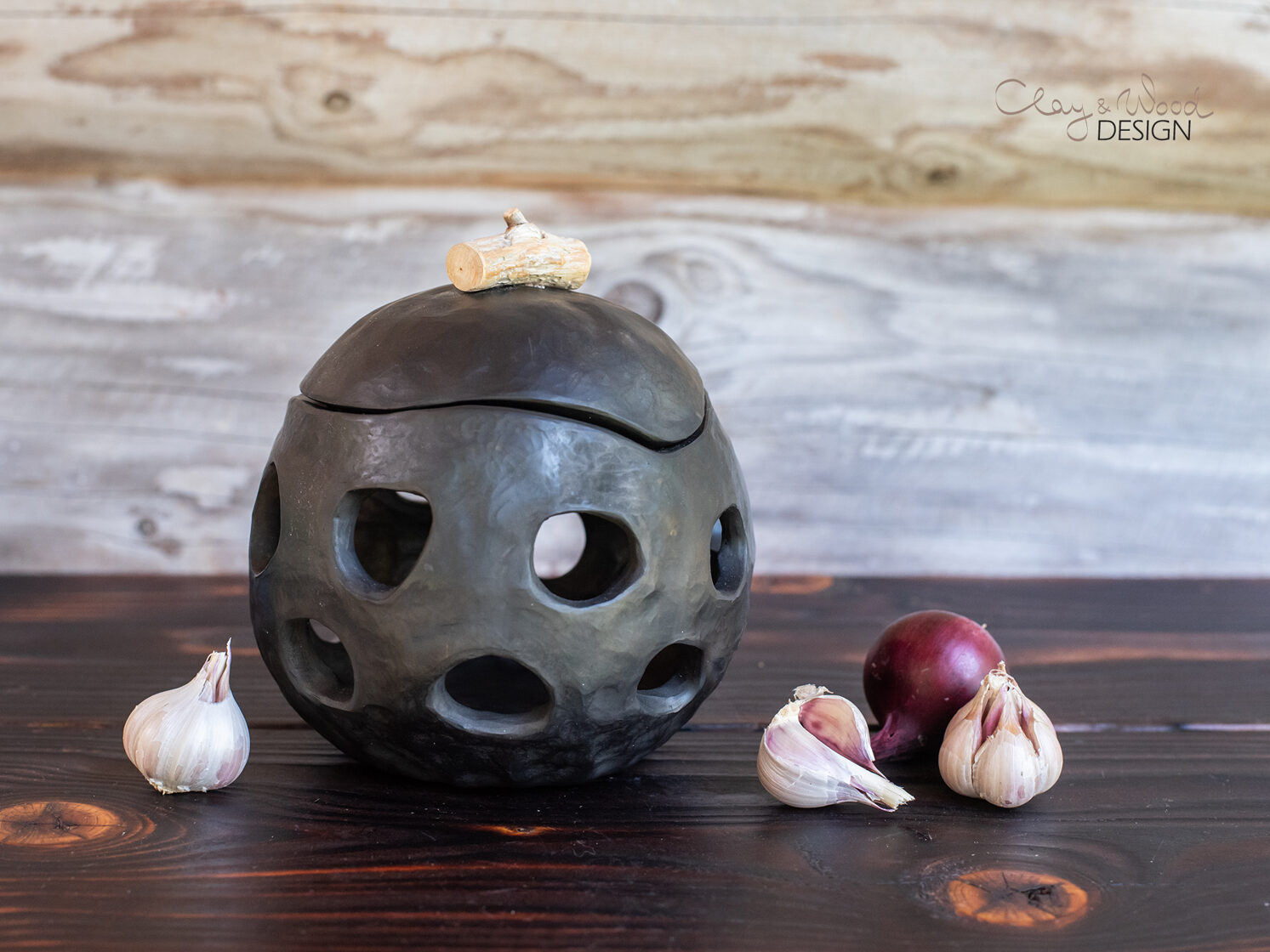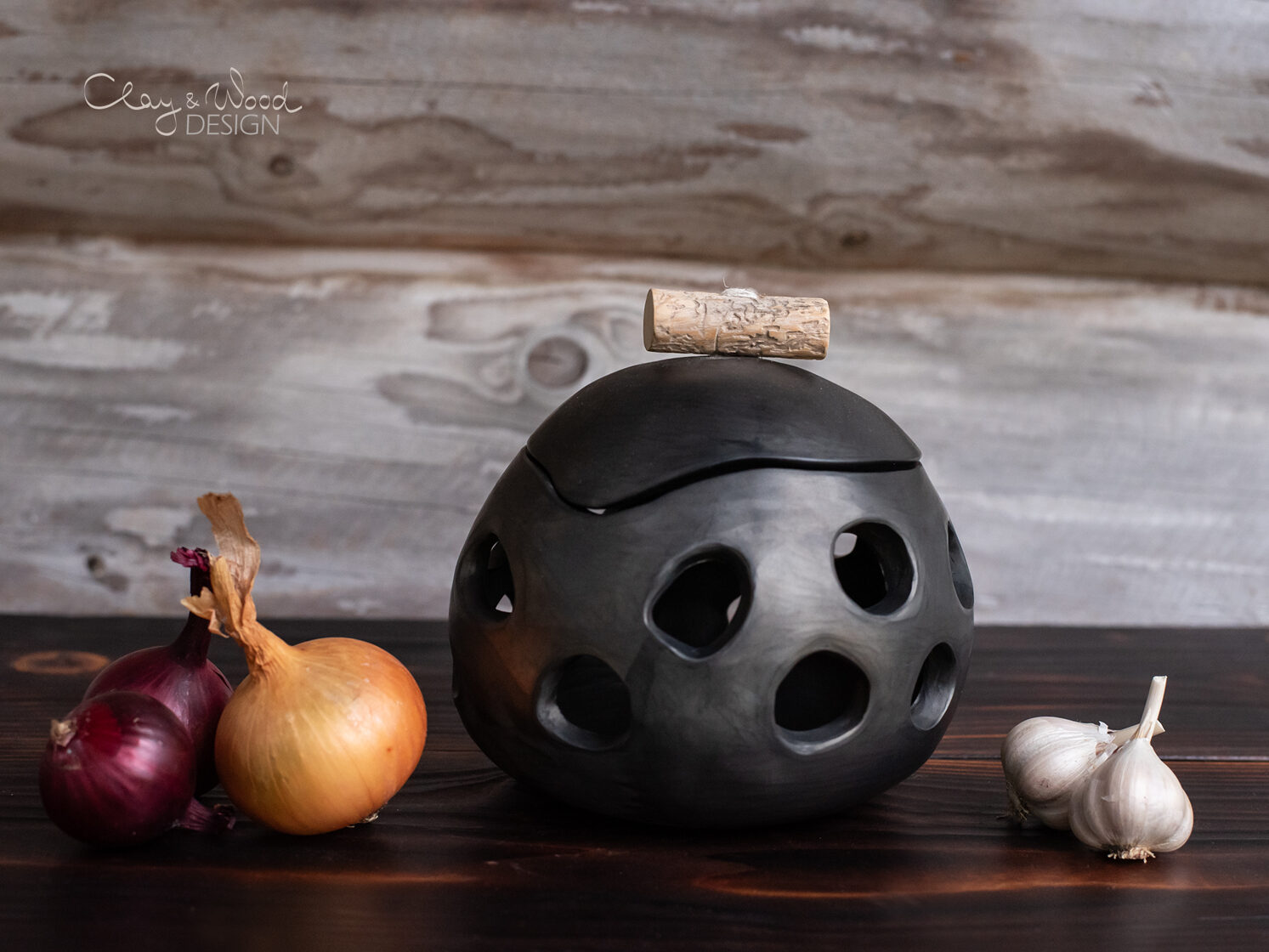 Handmade Ceramic Onion & Garlic Cellar: Unglazed Black Pottery Jar -