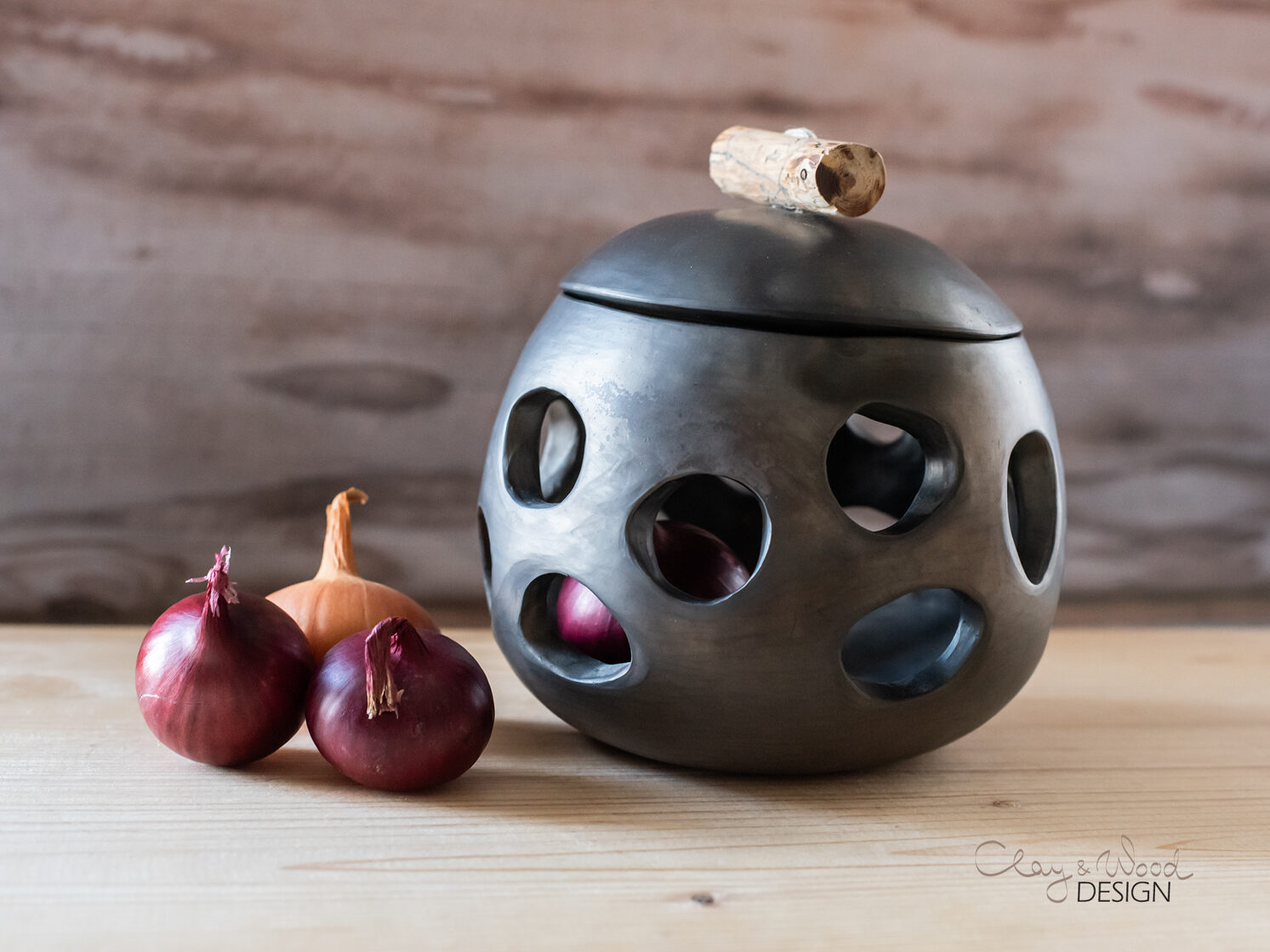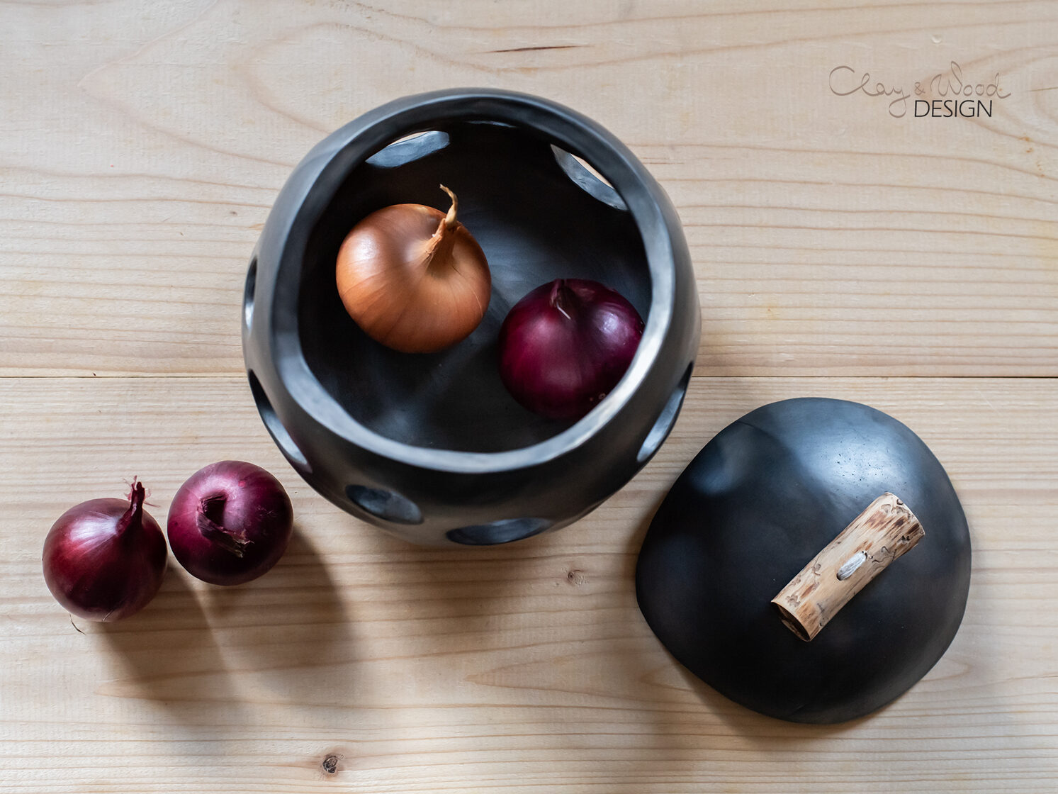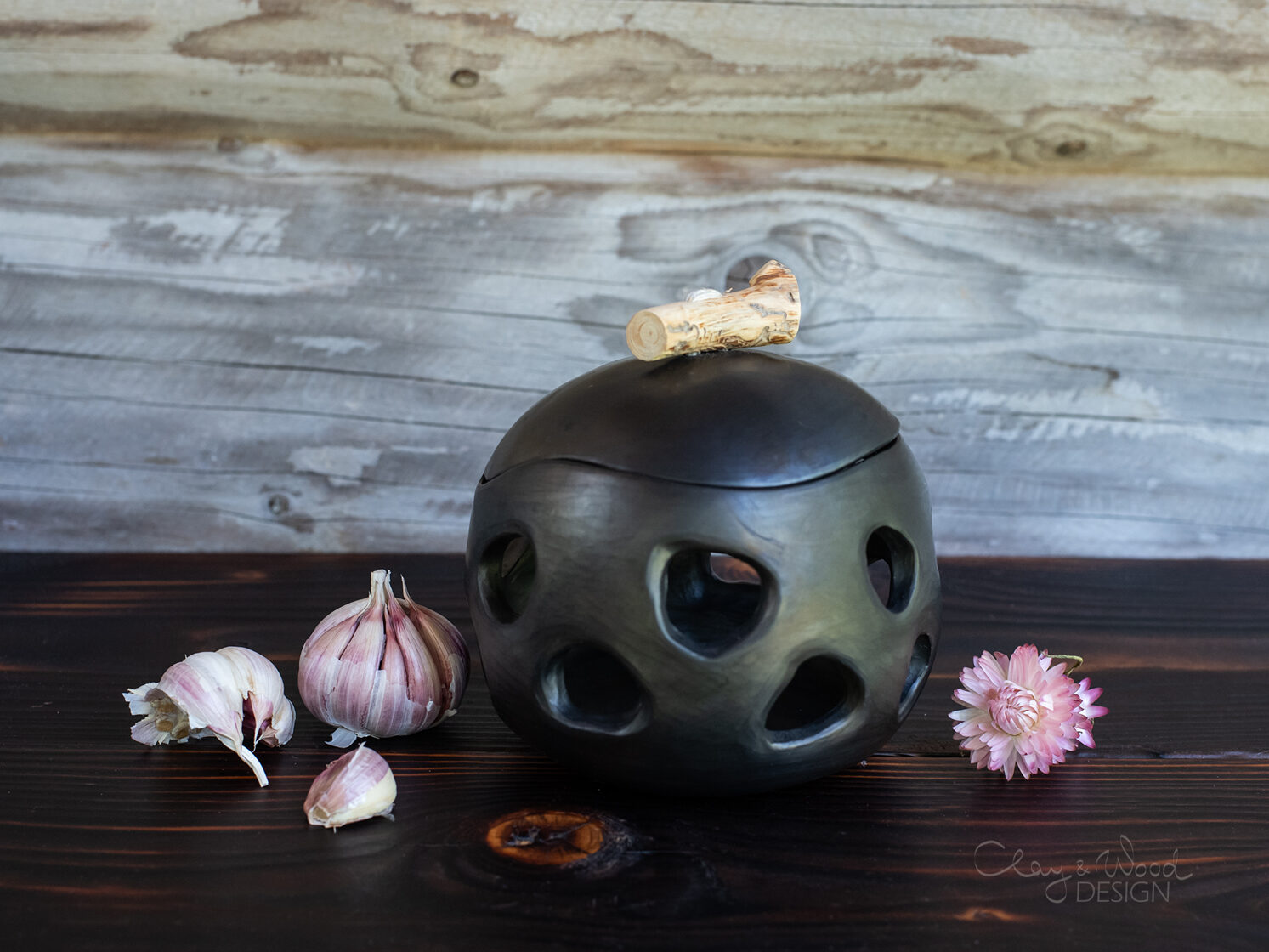 Handmade Ceramic Onion & Garlic Cellar: Unglazed Black Pottery Jar -